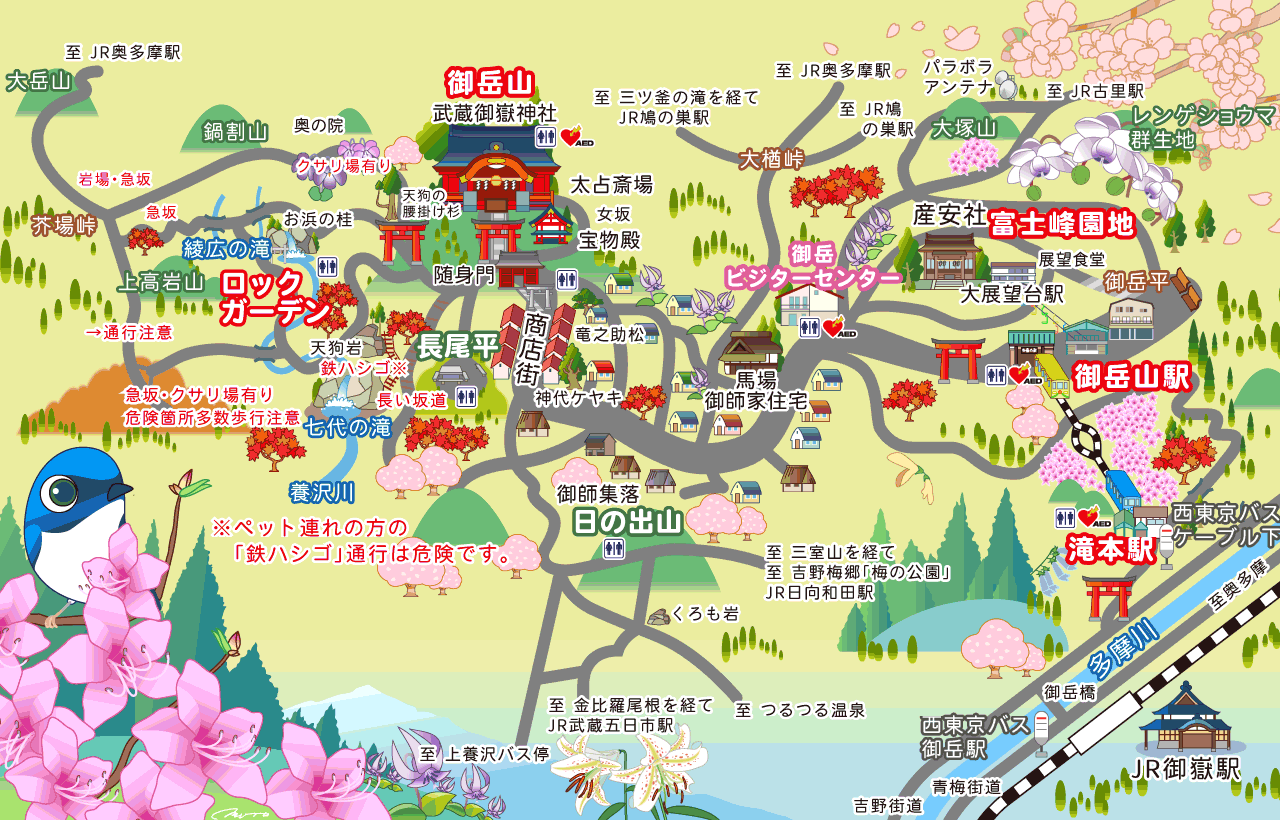 登山路线 : 从JR青梅線御嶽駅到登山口(ケーブルカー御岳登山鉄道滝本駅)徒步大约需 要50分钟,乘巴士需要十分钟
