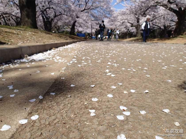 | 落在地面上的花瓣 沿着樱花路一直往前走,会看到一大片树林。因为除了树林最外边的几棵樱花树之外在我看来这里并无亮点,所以本打算一掠而过,但碰巧赶上一阵风吹过,结果我收获了一个难以忘记的美景。只见一阵微风轻轻吹过,树林最外边的樱花树的树枝也随风轻摇,树枝上面的花瓣就像约好了似的跳着轻盈的舞缓缓飘落…好一幅落樱的美景! |